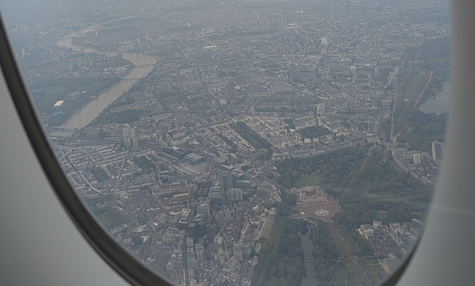 飛行機では眠れなかったような気がするが、ロンドン上空を旋回しながらヒースローへ向かってくれたので、グーグル地図で見たテムズ川付近の街並みを窓から何枚か撮影した。