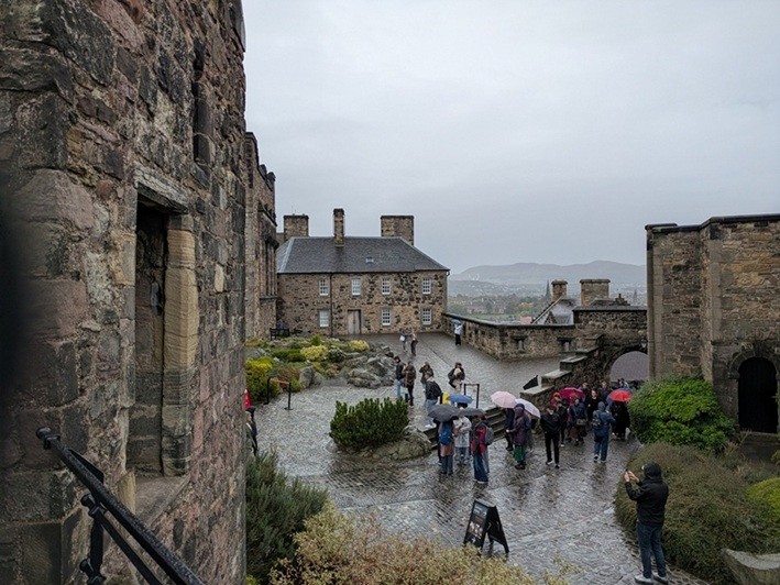 エジンバラ城につくころには雨が本降りに。入口広場に入場を待つ人がいたが、観光客やアジア系の人が傘をさすぐらいで傘を持たない人も多い。エジンバラ城は丘の上の石造りの大きな城ではあるけれど、城としての機能は日本の戦国時代の城と違いはない。エジンバラ自体が城下町であり緩い坂が多いところも後日訪れたノリッジという城下町と共通している。もちろんともに大きな教会が建っている。