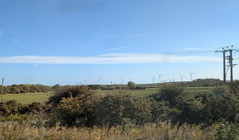 列車はエジンバラから海岸線を通り、ニューカッスルなど経由して4時間半でロンドンに着く(新幹線の広島東京間所要時間と同じ)。ずーっと車窓から景色を眺めていたので、眼前に広がるのは、いわゆる緑と茶色の牧草地と時折の集落、そして海岸線の灯台や立ち並ぶ風力発電の風車だった。