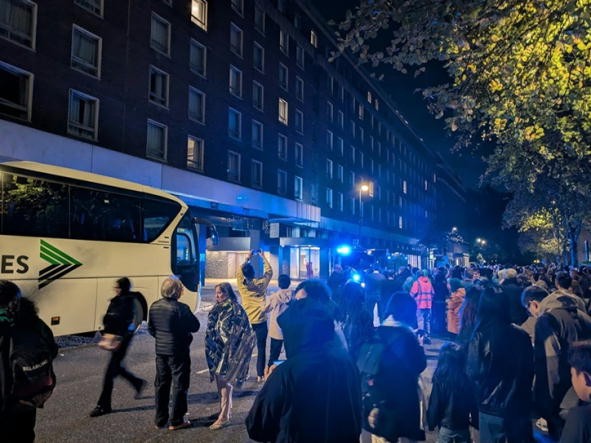 | 避難した宿泊客(青いライトが消防車) |