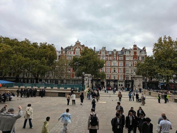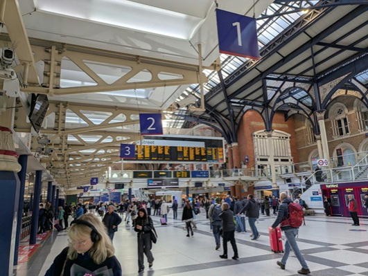 午後5時前にホテルを出て、まずは北を目指して、翌日ノリッジに行くときの出発駅である(と思い込んでいた)ユーストン駅まで15分ほど歩いた。出発前の調べではユーストン駅につながるビルの大きな階段があったので、それを見つけて上がってみたら入口は封鎖中だった。実際はその手前のいわゆるバスセンターみたいな場所の通路を抜けるとユーストン駅なのだった。