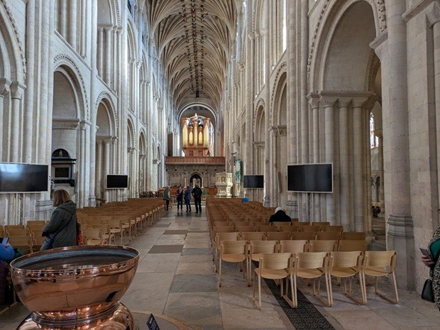 | ノリッジ大聖堂本堂 左下にチョコレート製造会社が寄付した洗礼用桶が見える |