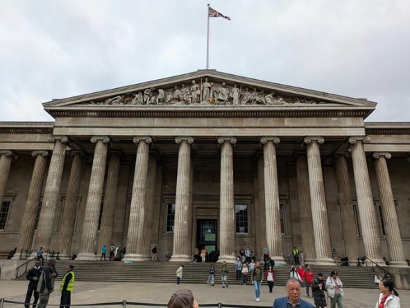 | 入館を待つ行列 | 有名な大英博物館正面玄関 | 正面玄関から見た前庭 |