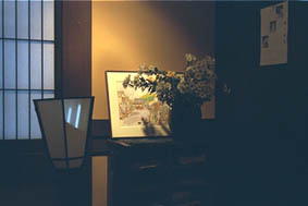 それから、竹鶴酒造を見学。ニッカの創業者と同じ名前だと思ったら、ご当人の生家であるとの由(でも分家の出だとか)。その観光客向けの展示部屋の奥に、非常に精緻なタッチの絵が飾られていて、これがなんと真鍋博の原画(!)。なんでも、今年(1997年)の3月に雑誌の特集のために竹原の絵をイラストに描いて、原画を竹鶴酒造に寄贈していったらしい。五十嵐夫妻と3人で思いっきり感動するが、説明してくれた竹鶴のおばさんは3人の感動の理由をきっと誤解していたと思う(笑)。