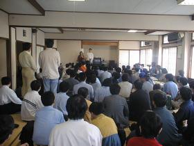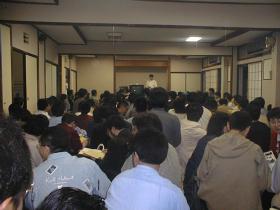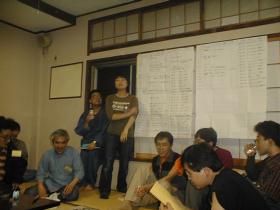 夕方に雨が降ったらしく、まだ少し雨が残っていたが、食事に行き、本郷の合宿所へ。オープニングは大広間に集まると足の踏み場もない状態。