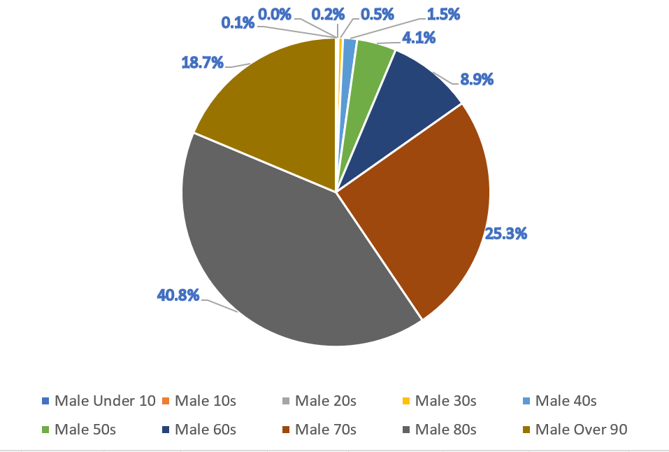 ここで上図が男性の年齢別死者、下図が同じく女性です。紺色の部分が60歳代でここを境に高齢者とそれ以外に分かれます。これを見ると男性死者の93.7%が60歳以上、同じく女性の場合は97.2%です。大半を高齢者が占めています。65歳以上の高齢者は全人口の29.1%(男の26%、女の32%)です。男女には違いがあり、陽性者に対する死亡率は、90歳代(男6.65% 女3.73%)、80歳代(男3.86% 女2.07%)、70歳代(男1.28% 女0.53%)、60歳代(男0.32% 女0.10%)と、どの年代でも男性の死亡率は高い。円グラフでは90代女性の占める割合が大きく見えますが、女性の生存者が3倍多いためです。男は寿命的にそこまで生きられません。死亡率で見るなら女性は男性の半分です。高齢者人口全体の死亡率は0.14%(男0.18%、女0.11%)、同じく陽性者比死亡率は1.28%(男1.54%、女1.06%)に達します。罹ると100人に1~1.5人は確実に死ぬのです。