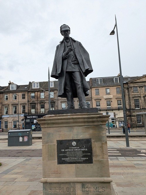 翌朝は宮城氏と11時出発の予定だったので、一人でホテルの周囲を散策。近くの広場に何やら銅像が立っている。近寄ってみたらなんとシャーロック・ホームズだった。びっくりして銘板を見ると「コナン・ドイルはこの近くで生まれた」とあって、二度びっくり。すっかり忘れていたよ。