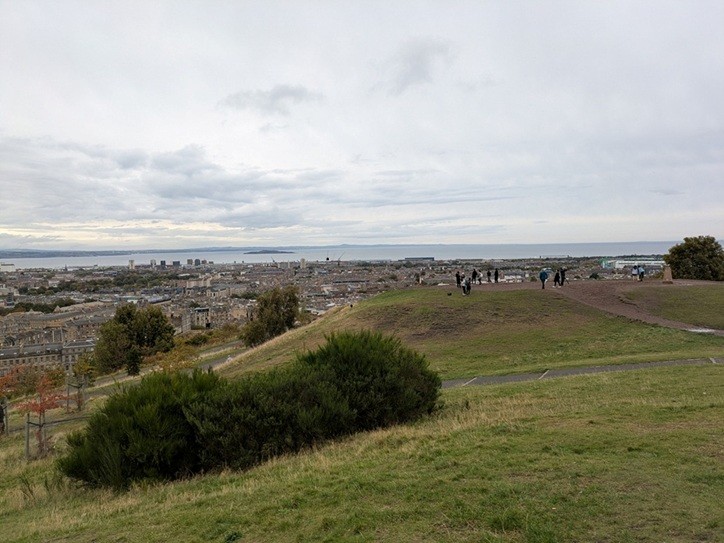 北側にFIRTH OF FORTH(ジェネシスの曲名にもある)の湾とエジンバラの町が一望でき、東の方にアーサーズ・シートと呼ばれる鞍(ふたこぶ)型の小山が見える。