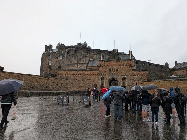 エジンバラ城につくころには雨が本降りに。入口広場に入場を待つ人がいたが、観光客やアジア系の人が傘をさすぐらいで傘を持たない人も多い。エジンバラ城は丘の上の石造りの大きな城ではあるけれど、城としての機能は日本の戦国時代の城と違いはない。エジンバラ自体が城下町であり緩い坂が多いところも後日訪れたノリッジという城下町と共通している。もちろんともに大きな教会が建っている。