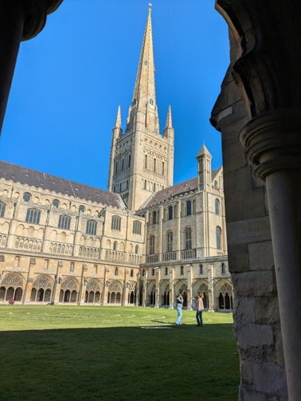 歩くことが難しい奥さんとは駅のそばで別れ、あとは抜けるような青空の下、彼の案内でノリッジの街歩きをした。ちょうど昼に着いたこともあり、まずはノリッジ大聖堂近くの軽食屋で軽い食事をした。当方は食欲がなかったのでソーセージを巻いた小さめのデニッシュにミルクティーを注文したのだけど、出てきたものをみたらソーセージが直径4センチくらいあった。長さは5,6センチとはいえソーセージはしょっぱく、残すわけにもいかないので完食したけど、これが当方の便秘を促進したようだ。