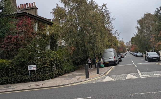 ところがグーグルマップで、アビーロードの位置を確認するたびにちっとも近づかず、かえって遠ざかっているようにも見えて、焦ったせいか、ぐるぐる歩いているうちにアビーロードを通り過ぎていたことに気づく。で、あの横断歩道は北にあるとの思い込みが手伝って、ようやくヴァイオレットガーデンという、すぐそこの角を曲がればアビーロードというところまで来て南(右手)に曲がればよかったのに、北へ向かって歩いてしまったのだった。