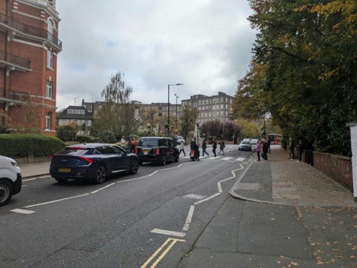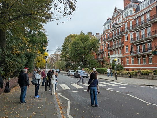 いつまでたってもそれらしい横断歩道に出くわさないので、とうとう諦めてベイカーストリートに戻ろうとアビーロードを南下していたら、何やら道の周りに人だかりが見えてきた。ようやくこれがあの横断歩道だったことに気が付いて、近づいてみるとオッサンオバサンたちが20人くらいで横断歩道を囲み、時折オッサンどもがポーズをつけて渡っていた。