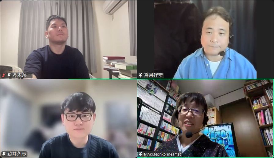 写真はZoomの画面ですが、左上から反時計回りに、冬木さん、鯨井さん、みいめさん(SFファン交流会)、香月さんです。